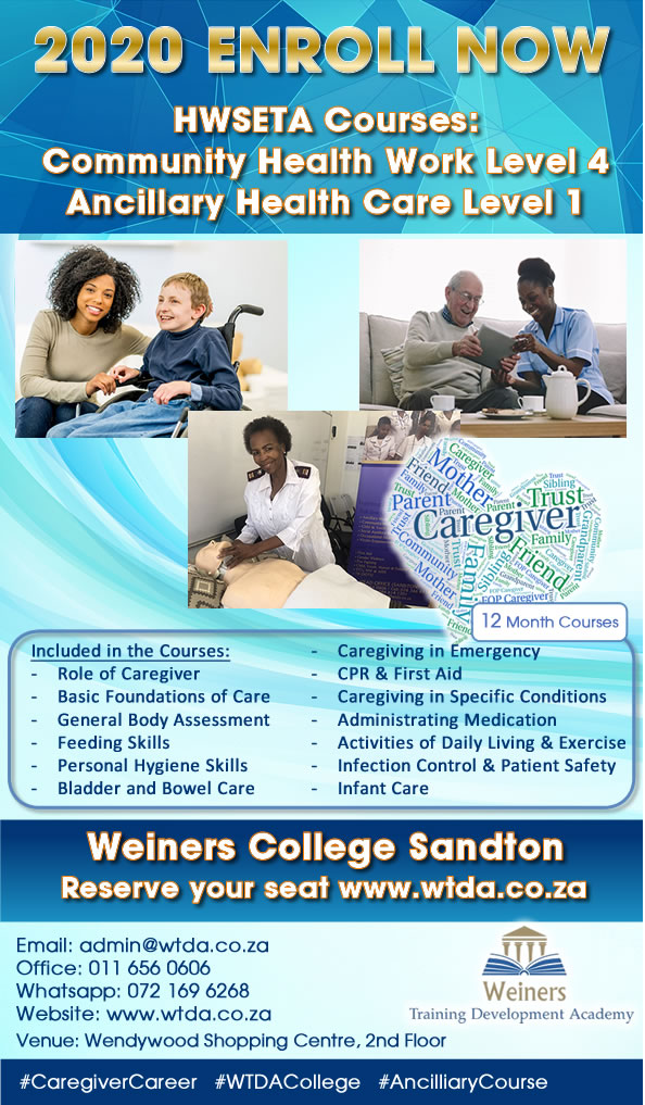 Weiners HWSETA Full-time CoursesAll courses offered through WTDA are accredited with the Health and Welfare Sector Education and Training Authority (HWSETA). Our academy has highly qualified Facilitators, Assessors and Moderators to provide Quality of Education & Training by offering Theorical and Practical experience to ensure best Programme Delivery. Our aim is to fully equip our learners with the knowledge and skills necessary to be the best caregivers they can be. Our academy aims to acknowledge each student, and treat them as individuals who have different strengths and weaknesses. The WTDA Campus has comfortable classrooms and equipment that is designed to simulate the health and welfare environment. We run our practicals at appropriate retirement villages and hospices in order to provide students with practical experience and give them a window into the world of caregiving to ensure that they are prepared to enter once they are trained and certified. Competent caregivers who have completed their studies at our academy have the option to apply at our sister company Complete Care for employment. Our WTDA HWSeta-accredited courses are comprehensive and valuable for all students, building their skills, understanding and compassion for an important career in caregiving. Secure your career and train for a profession that is truly impacting the lives of people on a daily basis. Secure Your Seat: Registration R1000 & Deposit R3000